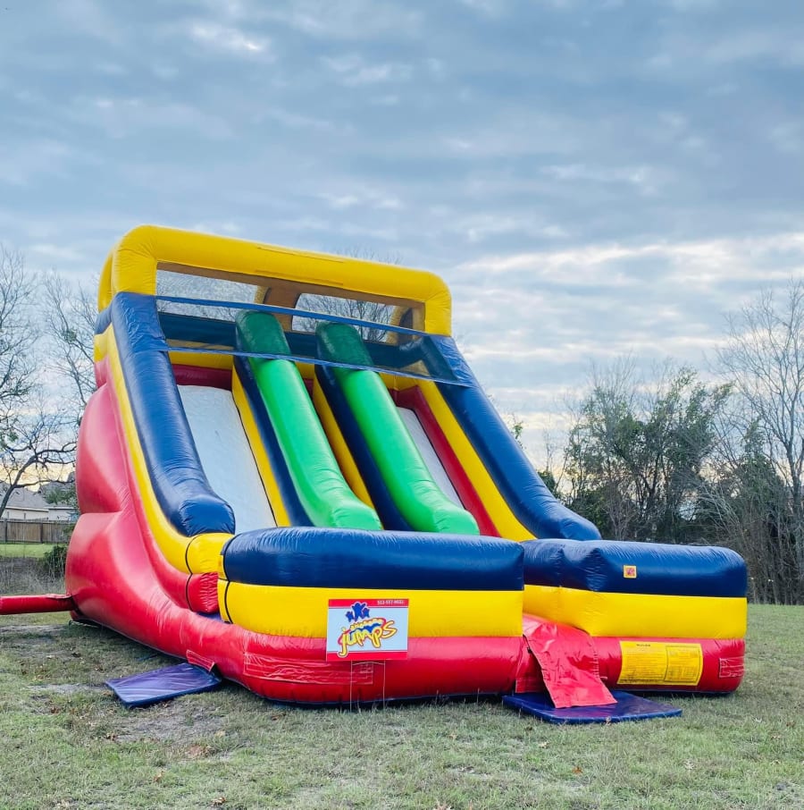 Looking for an exciting and thrilling addition to your next event or party? Our 18' Dual Lane Slide is the perfect choice! This dual lane slide is designed to provide hours of fun and entertainment for children and adults alike. With its impressive height and dual sliding lanes, it's sure to be a hit at any gathering.