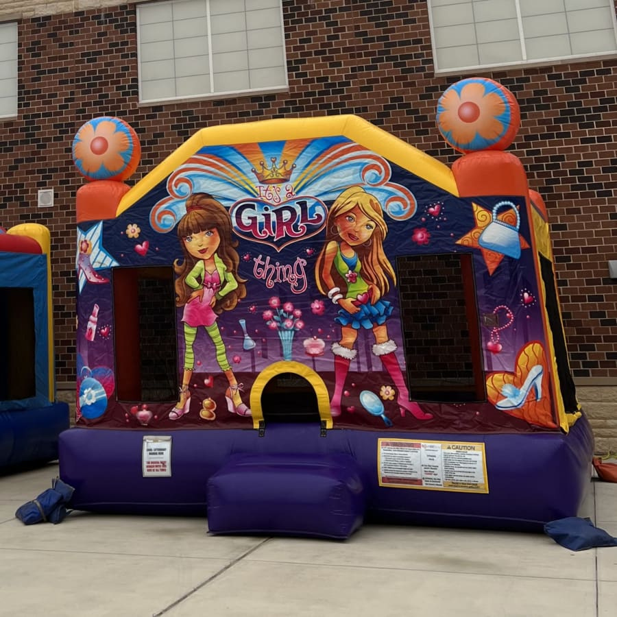 Looking for a way to make your little girl's party an unforgettable experience? Look no further than our Girls Bounce House! This 15-foot by 15-foot bounce house is specifically designed with a fun and vibrant girl-theme, guaranteed to capture the hearts and imaginations of young party-goers.